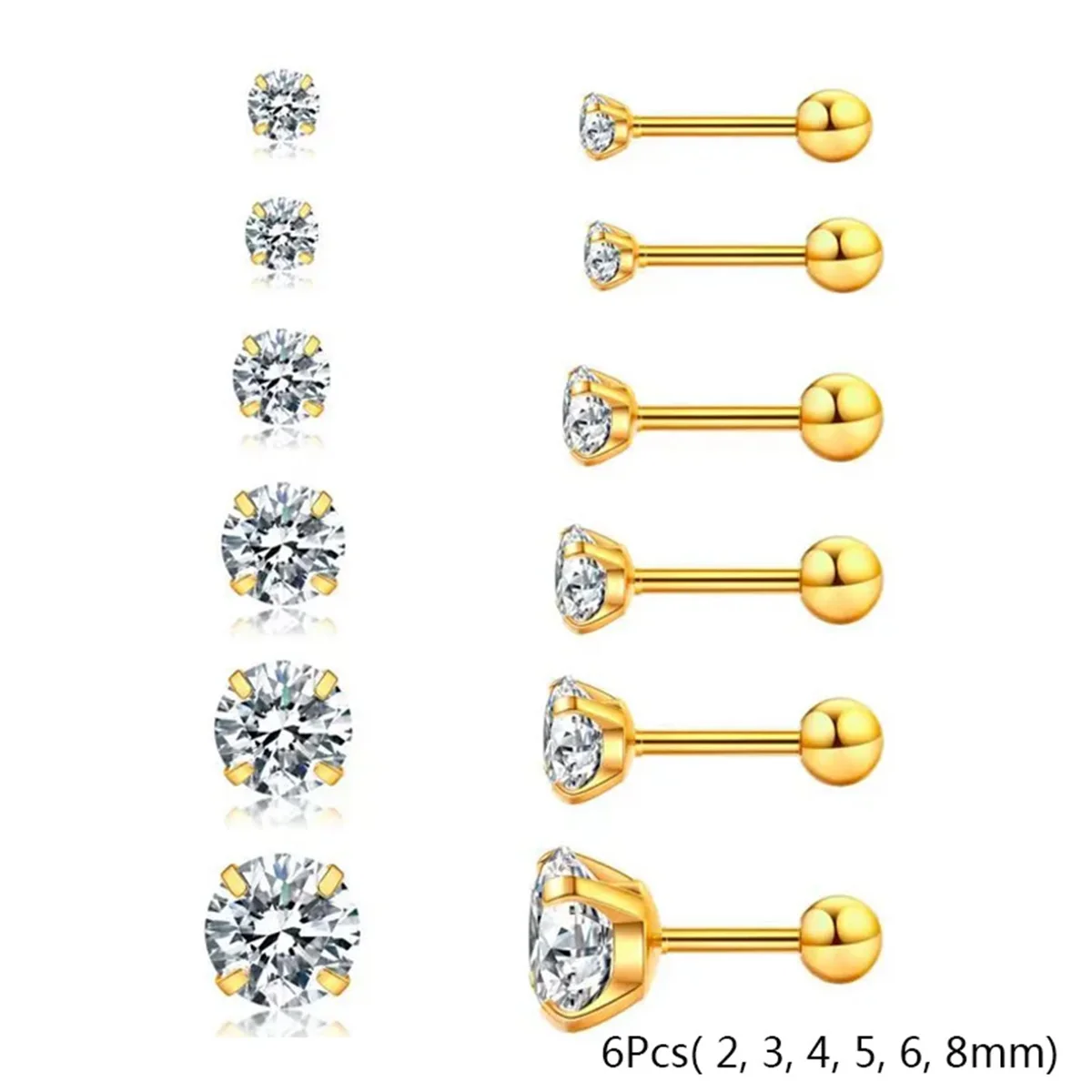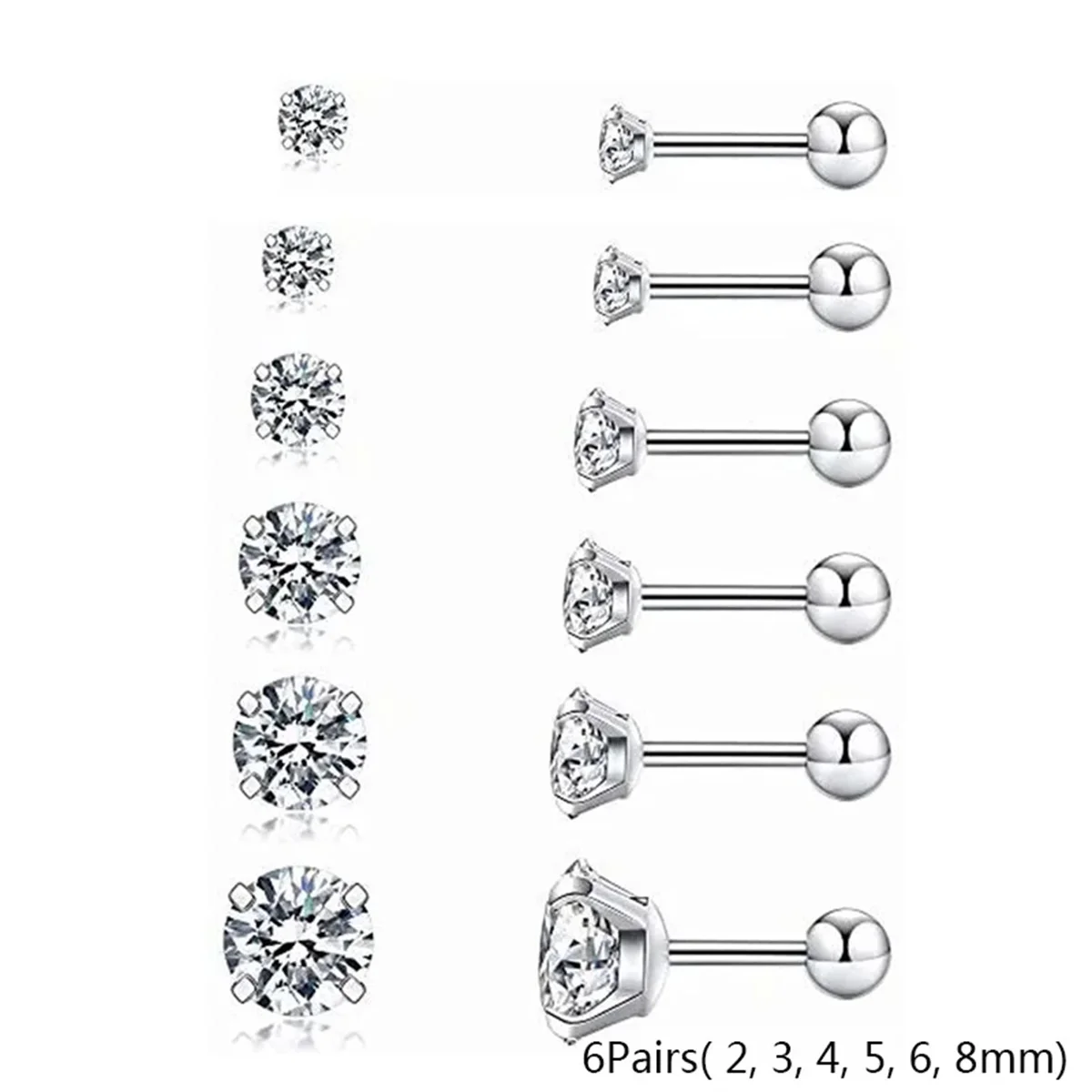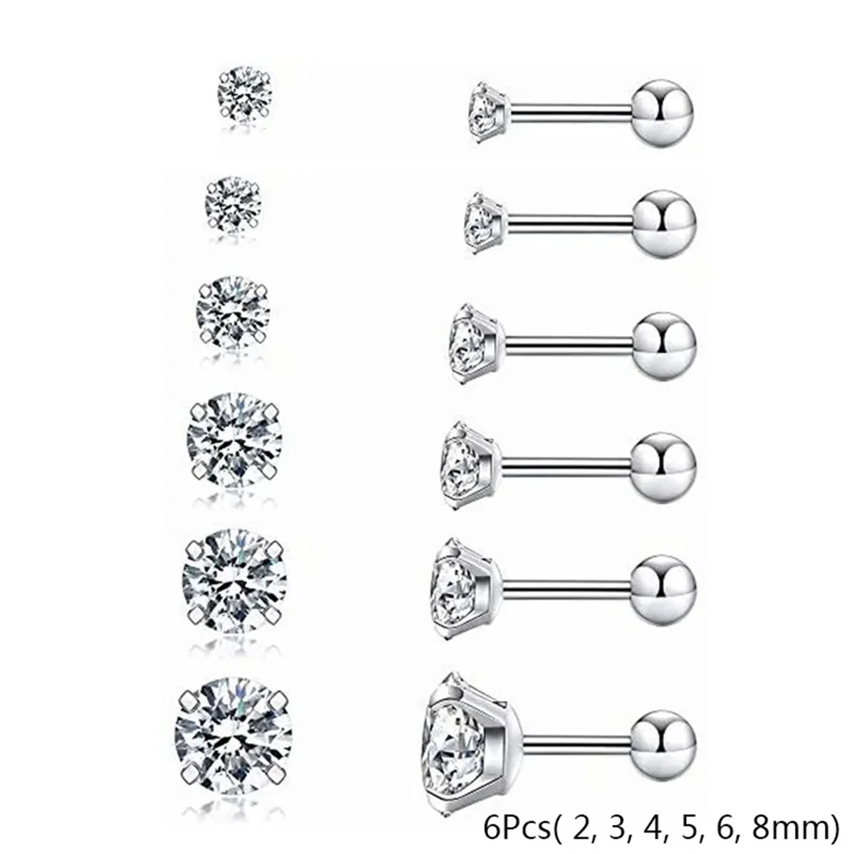2/6/12pcs 20G Inlaid Cubic Zirconia Stud Earrings,Stainless Steel Screw Back Barbell Studs Daith Tragus Cartilage Earrings