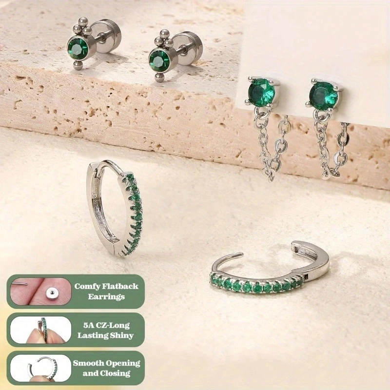 20pcs Stainless Steel Delicate Comfortable Green Gemstone Flat Back Earring Set,Hypoallergenic Small Hoop Earrings Jewelry Gifts