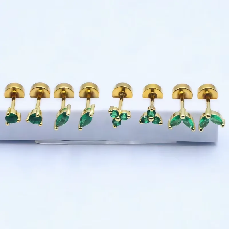 2Pcs Delicate Hypoallergenicity 18K Gold Green Gemstone Flat Back Earrings for Women Girls,Fashion Small Hoop Earrings Jewelry