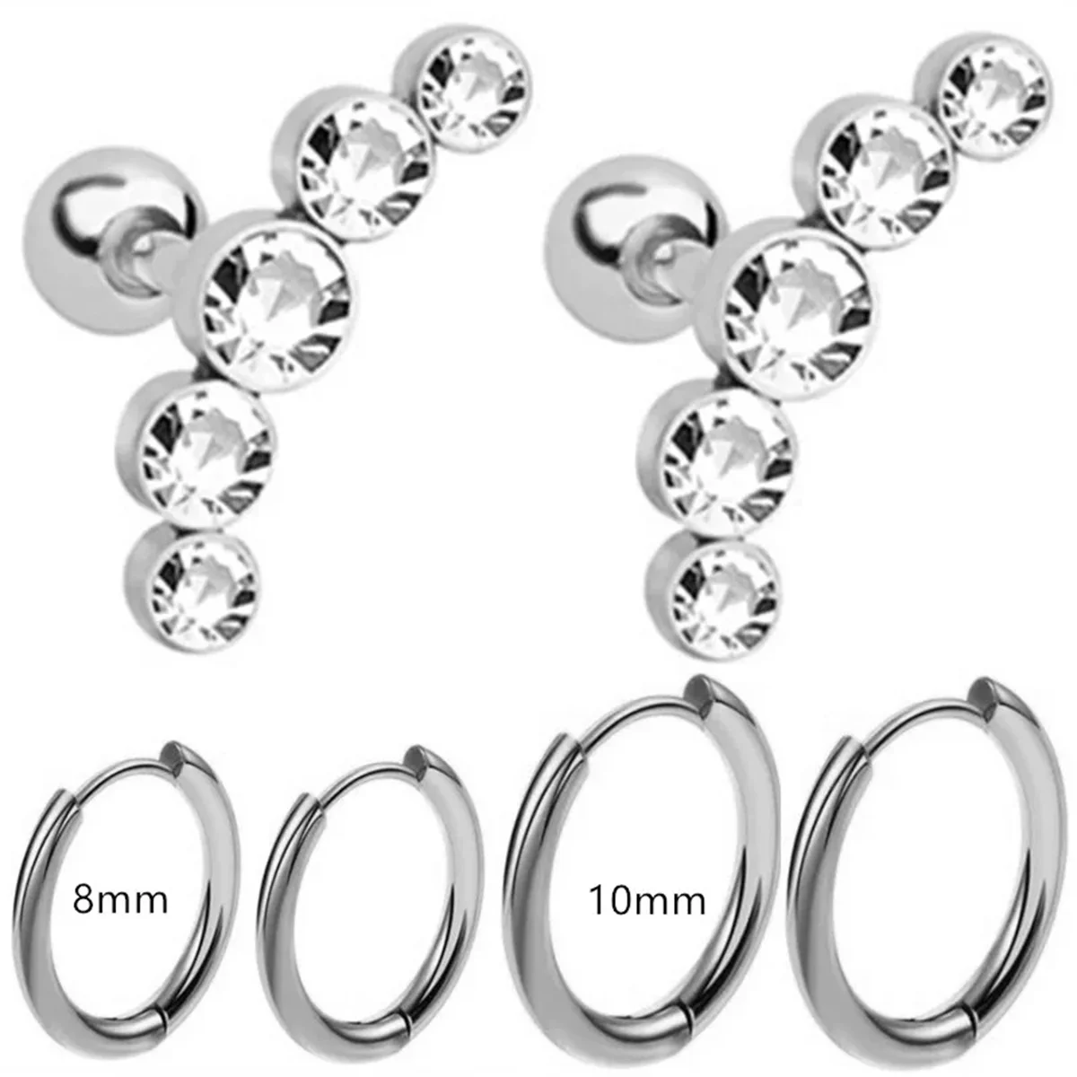 6pcs Fashion Novelty Stainless Steel Cyrstal Tragus Stud Earrings Set,Helix Cartilage Huggie Hoops Circle Ear Piercing Jewelry