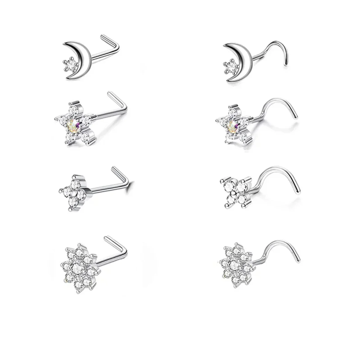 8Pcs 20G Fashion 316L Stainless Steel L Shape Nose Screw,CZ Hypoallergenic Nose Rings Studs Hoop Body Piercing Jewelry