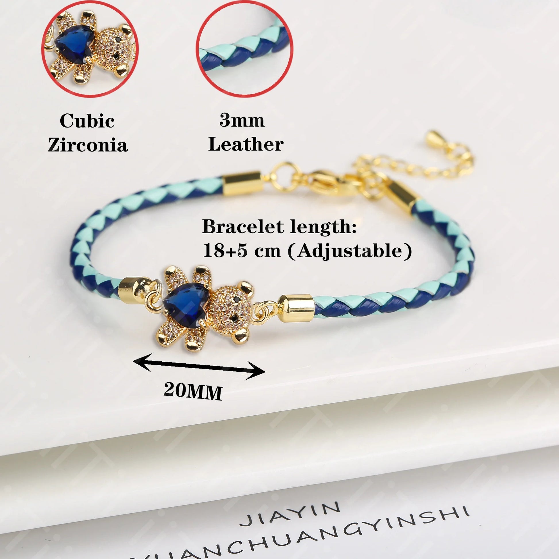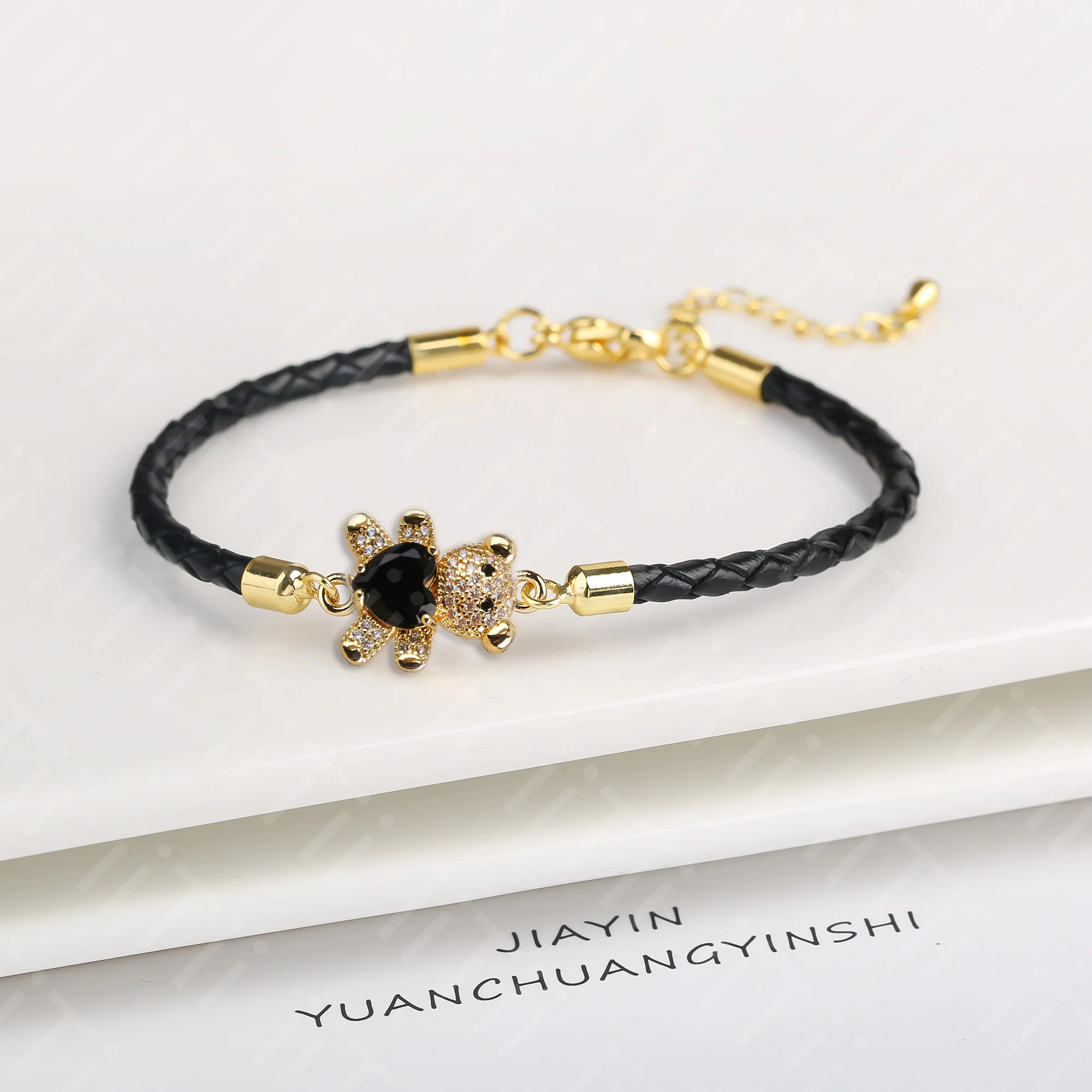 Name: Adjustable Cute Crystal Cubic Zirconia Bear Leather Rope Bracelet Classic for Woman Girl Wrist Jewelry Daily Wear Drop Shipping