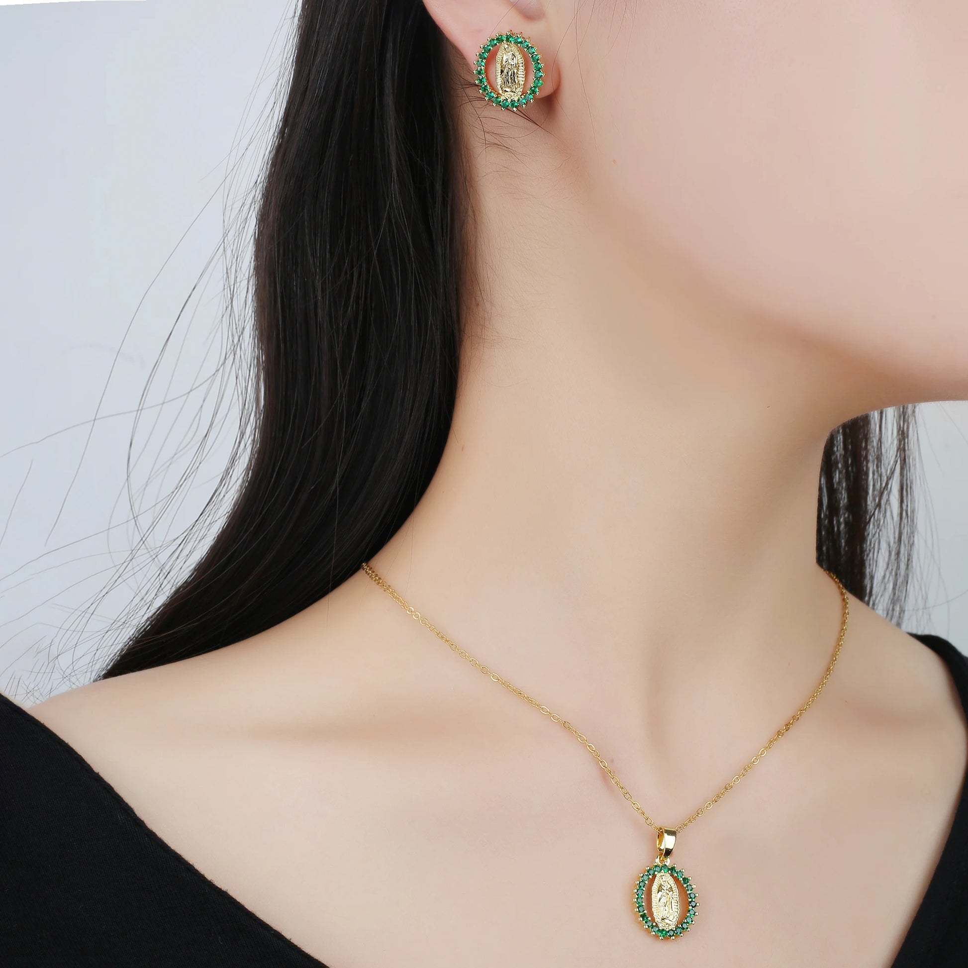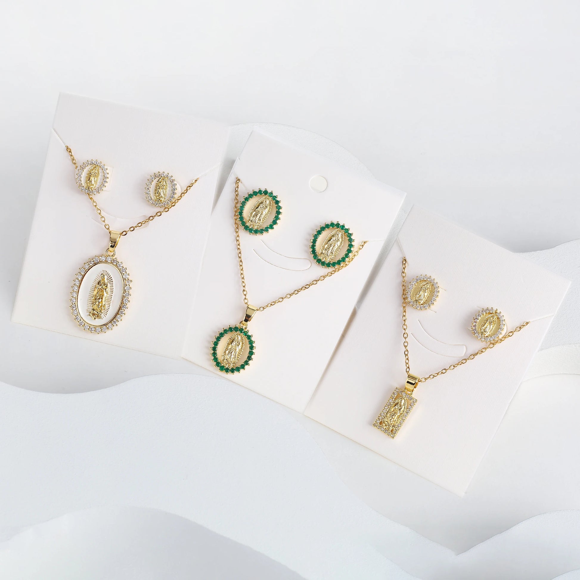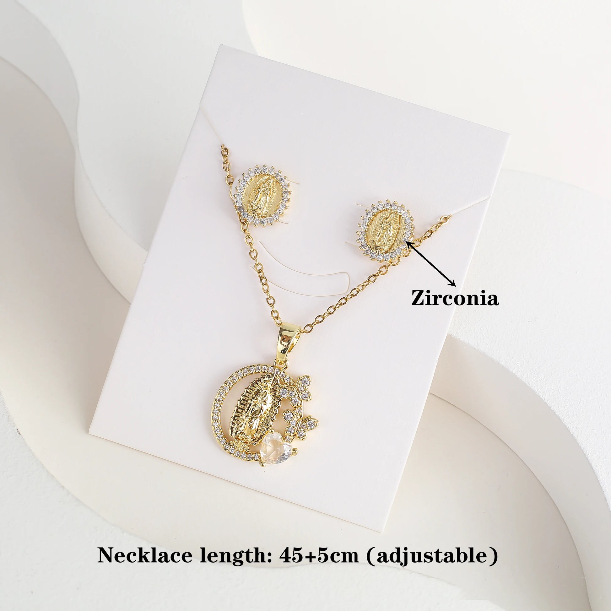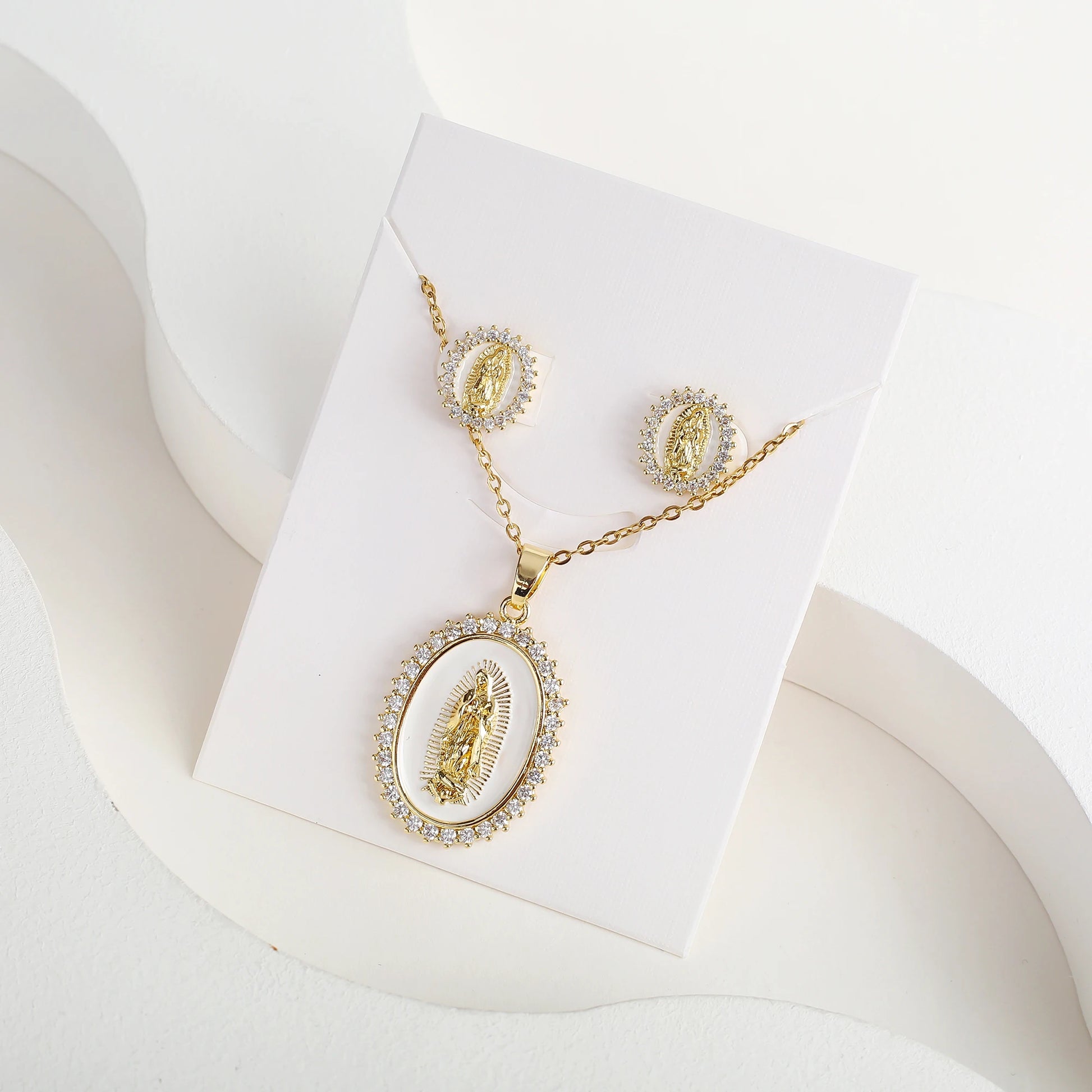 Classic Anti-Allergic Maria Pendant Necklace Set High Quality Zirconia 18K Gold Plated Stud Earrings Women Girls Religious Gifts