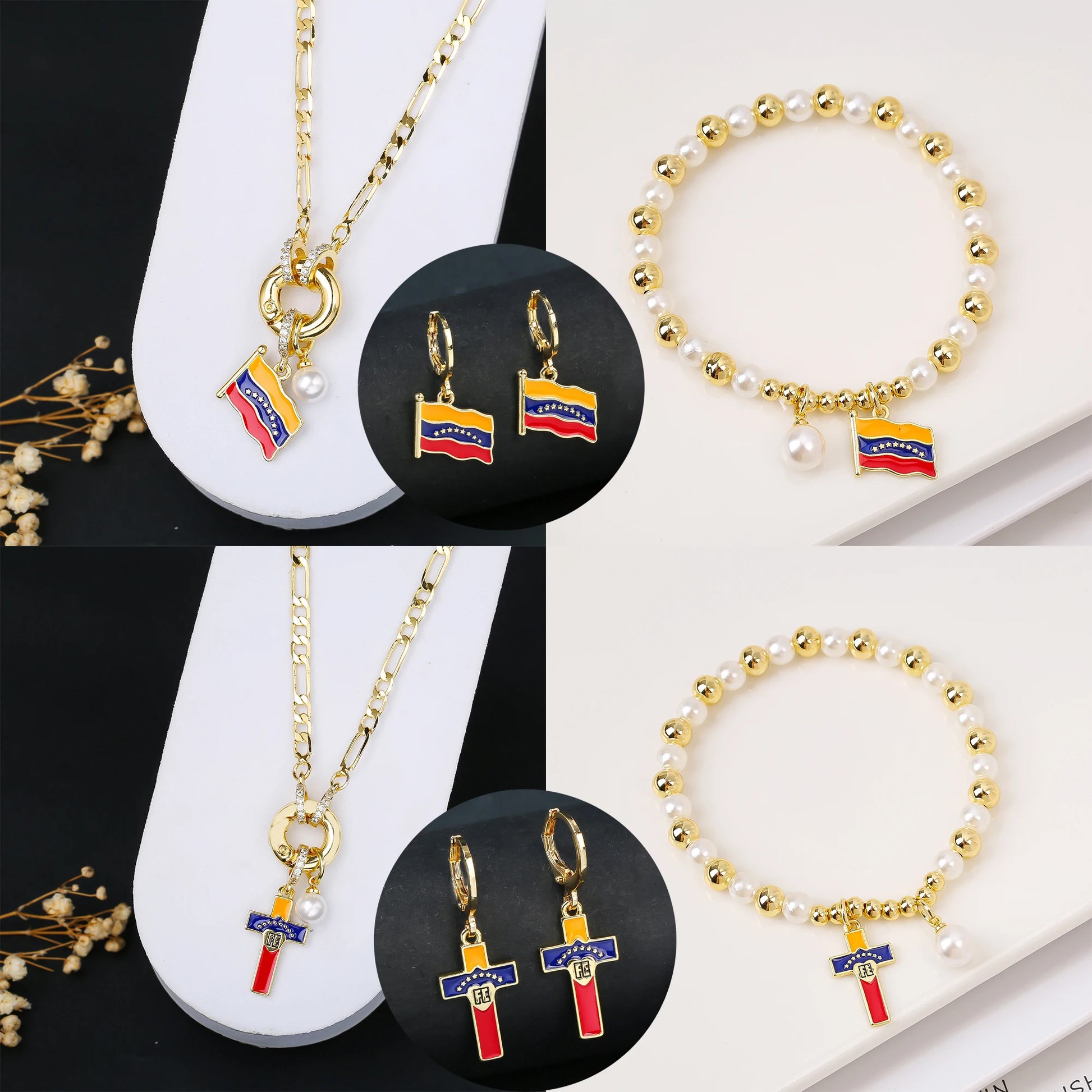 Name: Classic Venezuela Flag Cross Bracelet Earrings Necklace Jewelry Set Luxury for Women Girl Daily Party Pearl Jewelry Gift