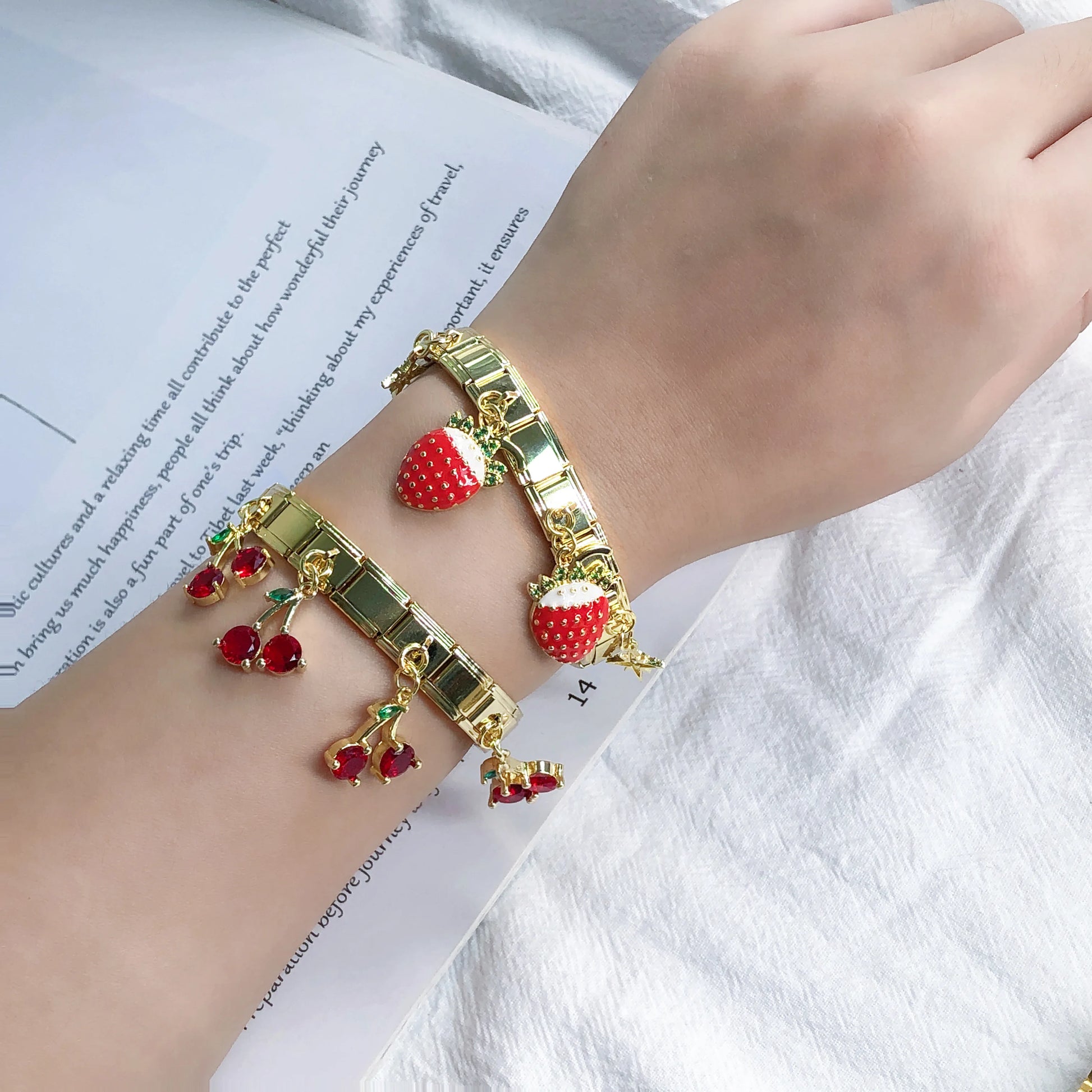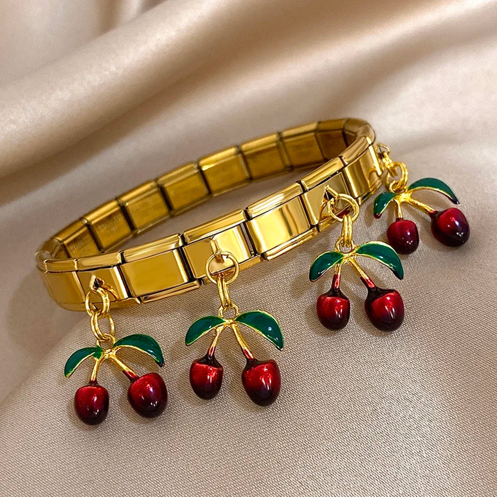 Geometric Square Stainless Steel Elastic Strap Bangle Bracelets for Women Strawberry Cherry Pendant Bracelets Hand Jewelry Gift