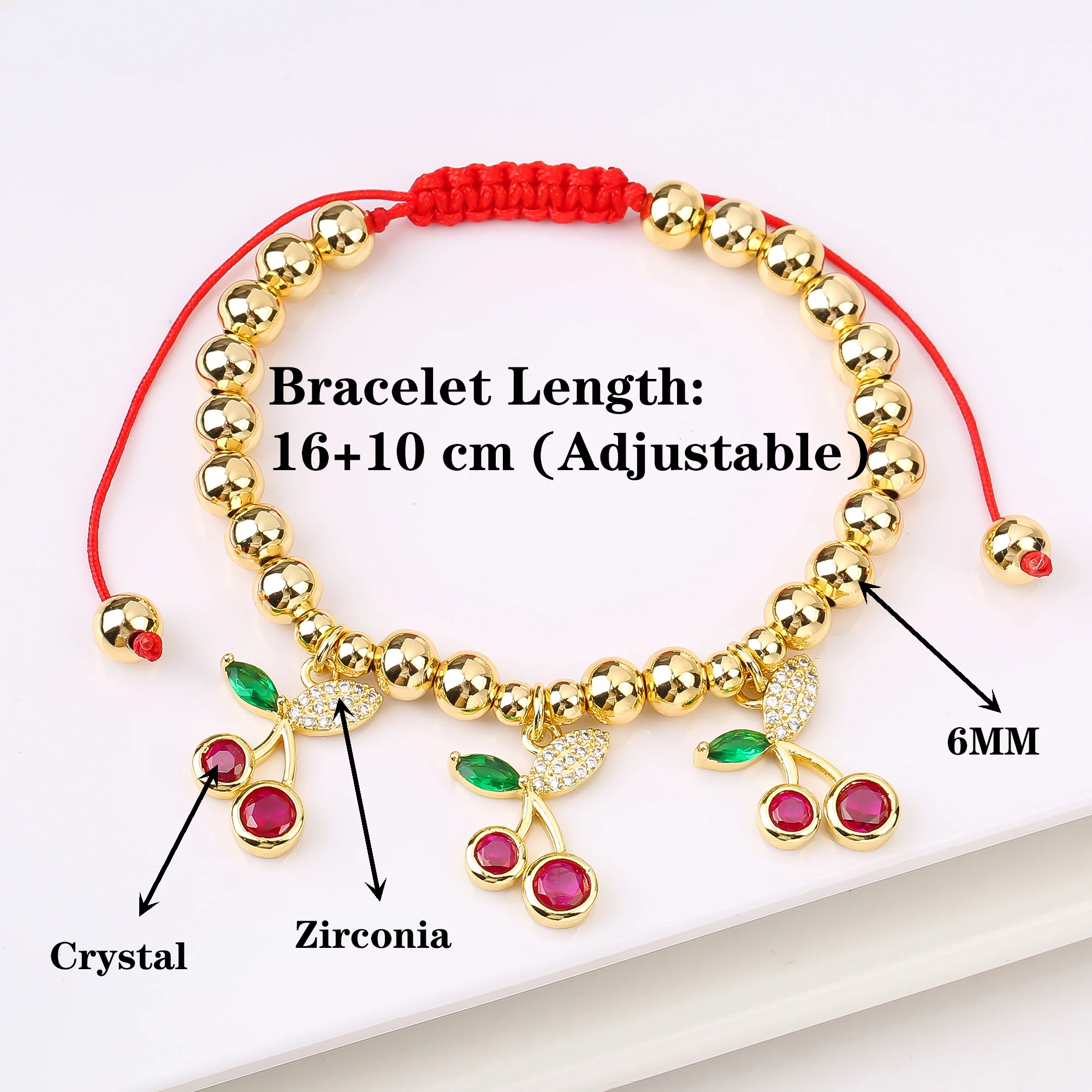 Gold Plated 6mm Copper Bead Chain Braided Fruit Cherry Crystal Adjustable Bracelet New Fashion Woman Girl Daily Wear Jewelry