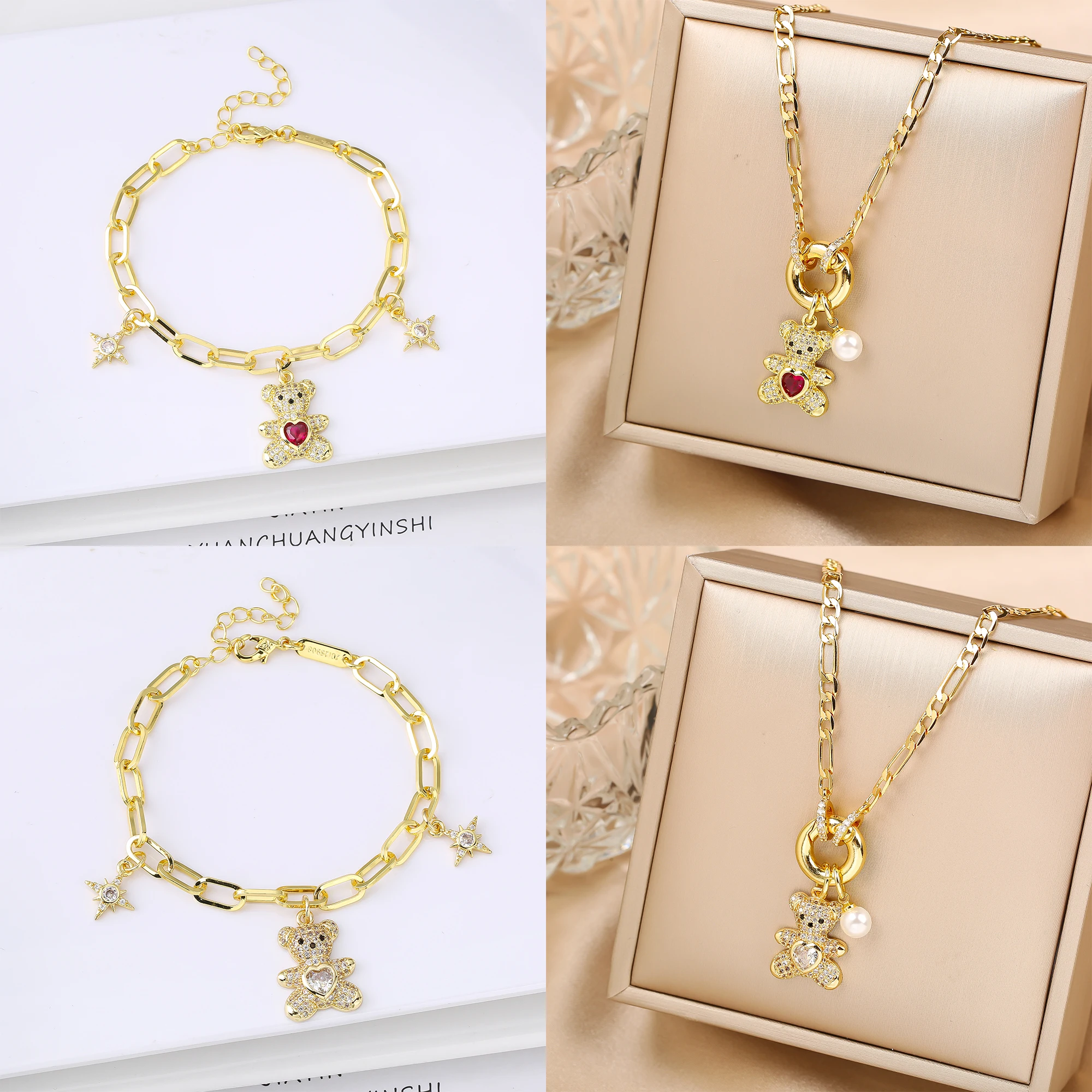Hot Sale 2PCS Animal Bear Zirconia Bracelet Jewelry Necklace Set for Women Female Daily Party Crystal Jewelry Girl Gift