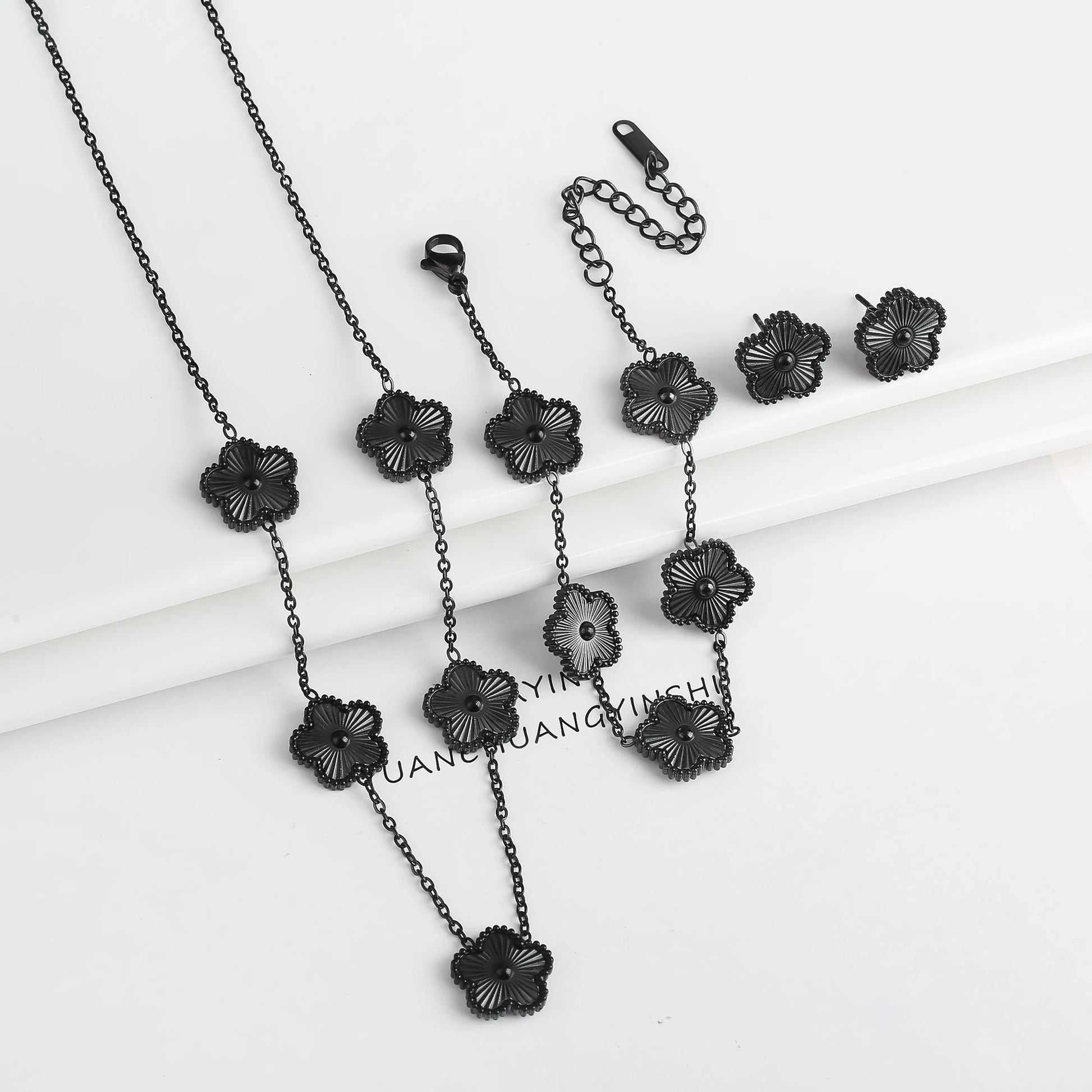 Hot Sale Stainless Steel Luxury Five Leaf Flower Necklace Earrings Bracelet Jewelry Set for Woman Party Flower Jewelry Clover