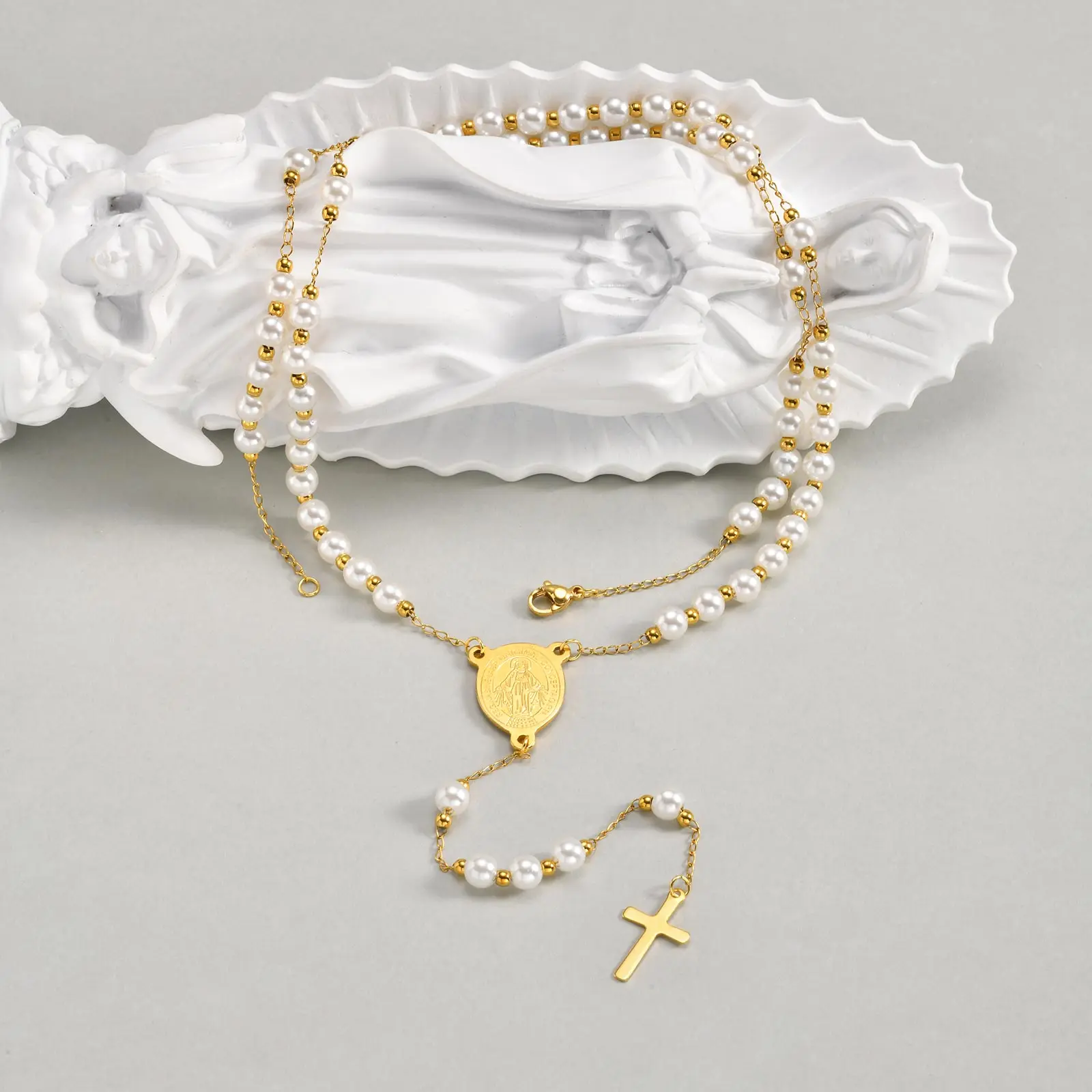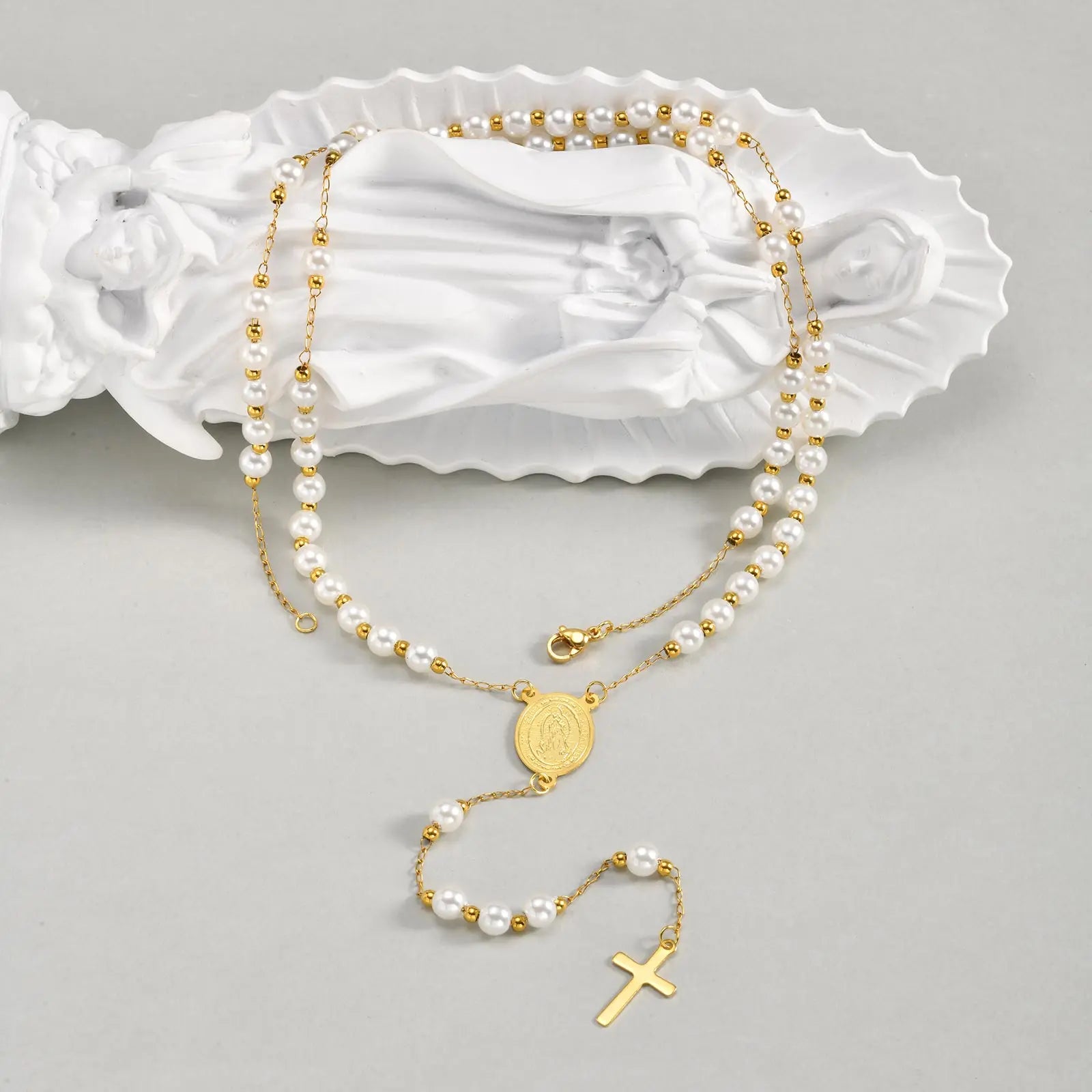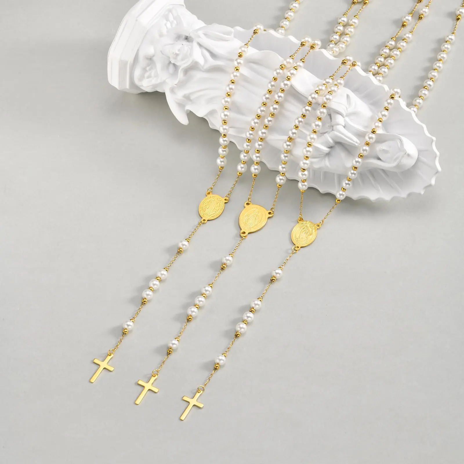 Imitation Pearl Beaded Chain Holy Virgin Mary Y-Shaped Necklace, Stainless Steel Cross Pendant Necklace,Religious Prayer Jewelry