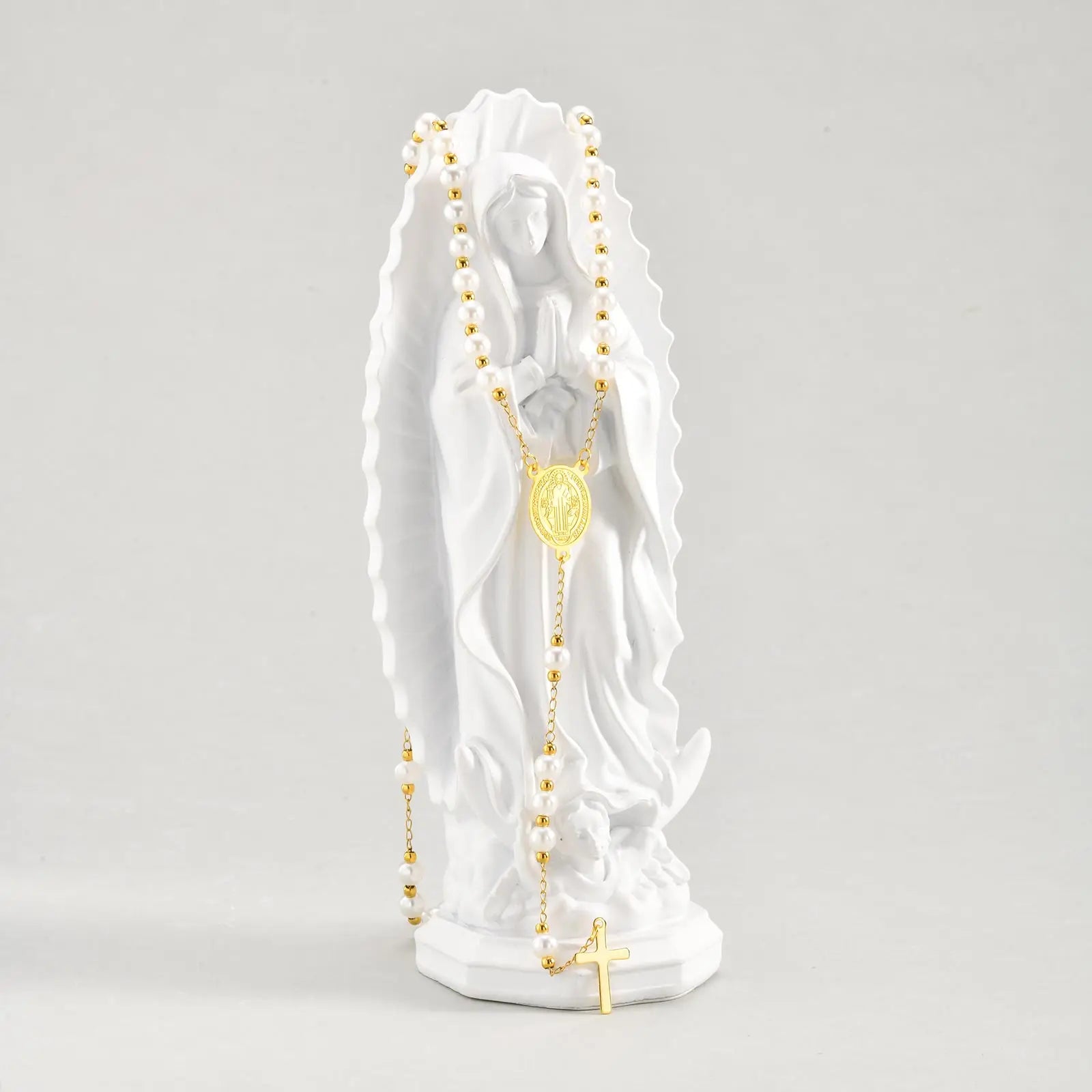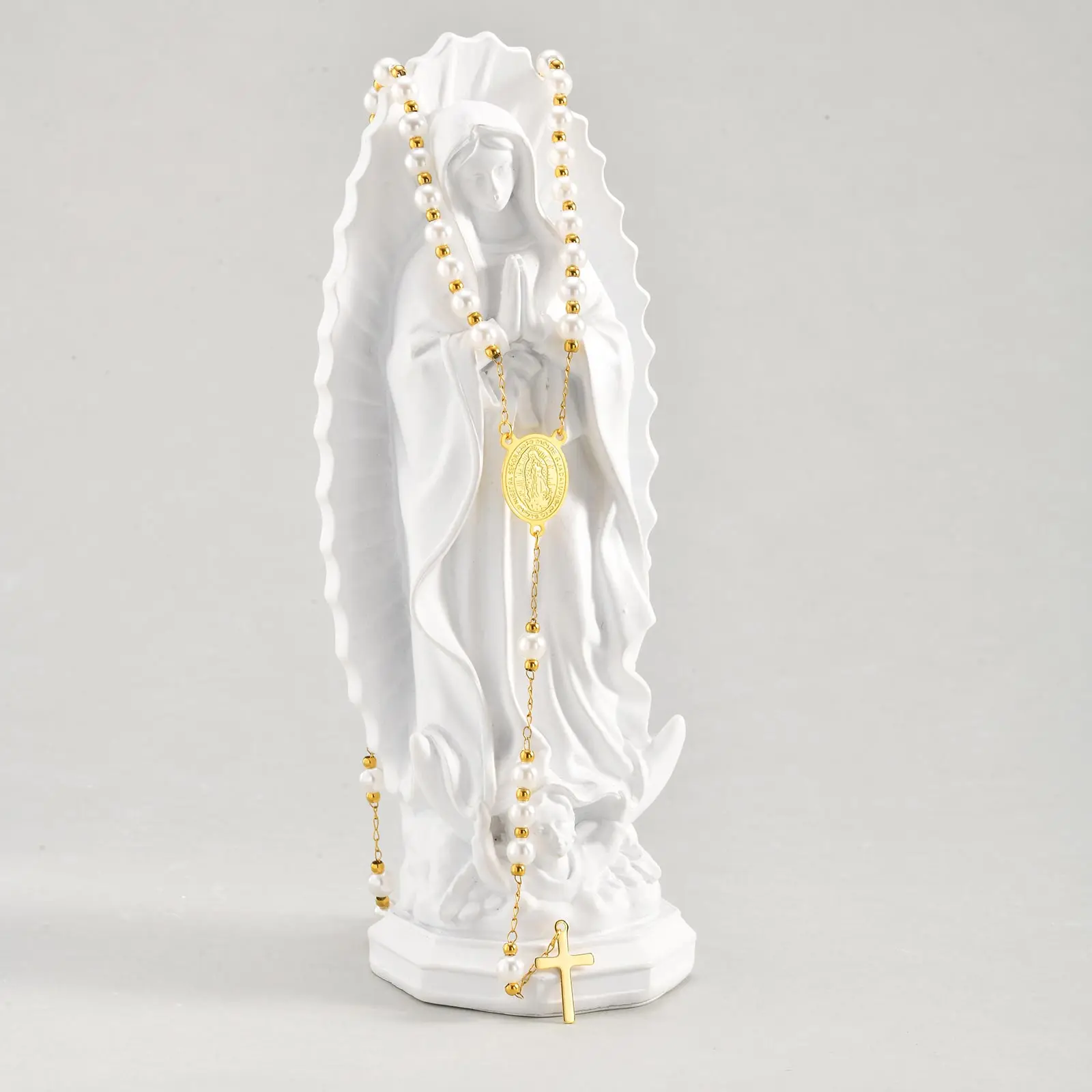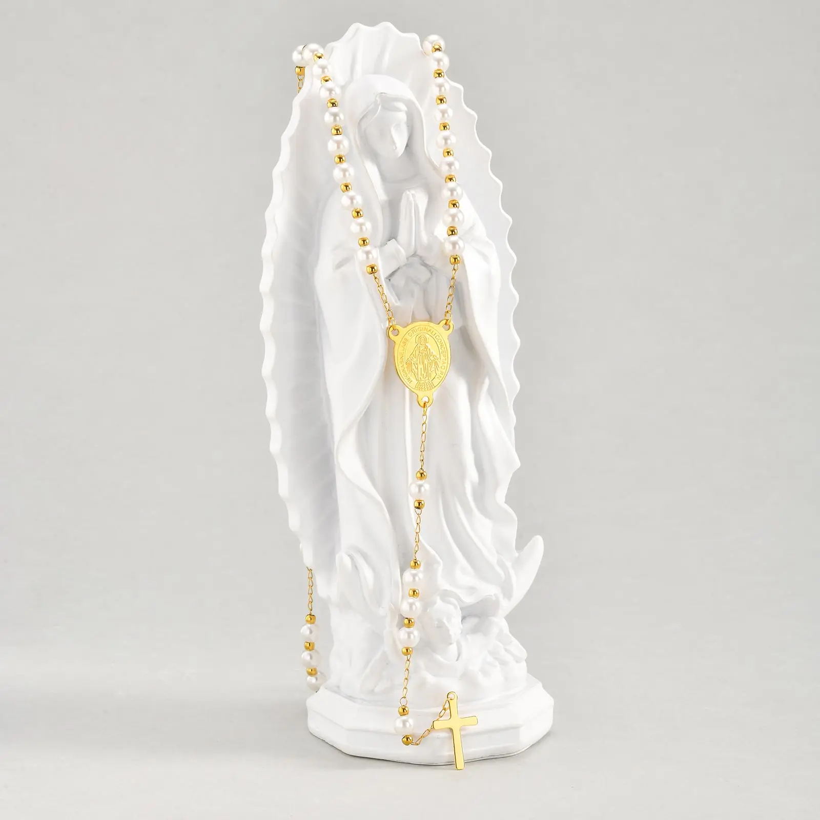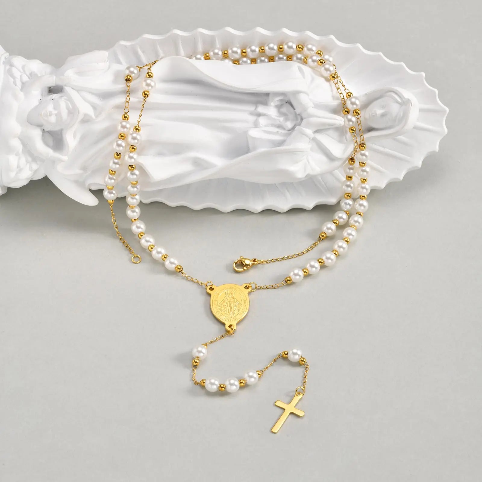 Imitation Pearl Beaded Chain Holy Virgin Mary Y-Shaped Necklace, Stainless Steel Cross Pendant Necklace,Religious Prayer Jewelry