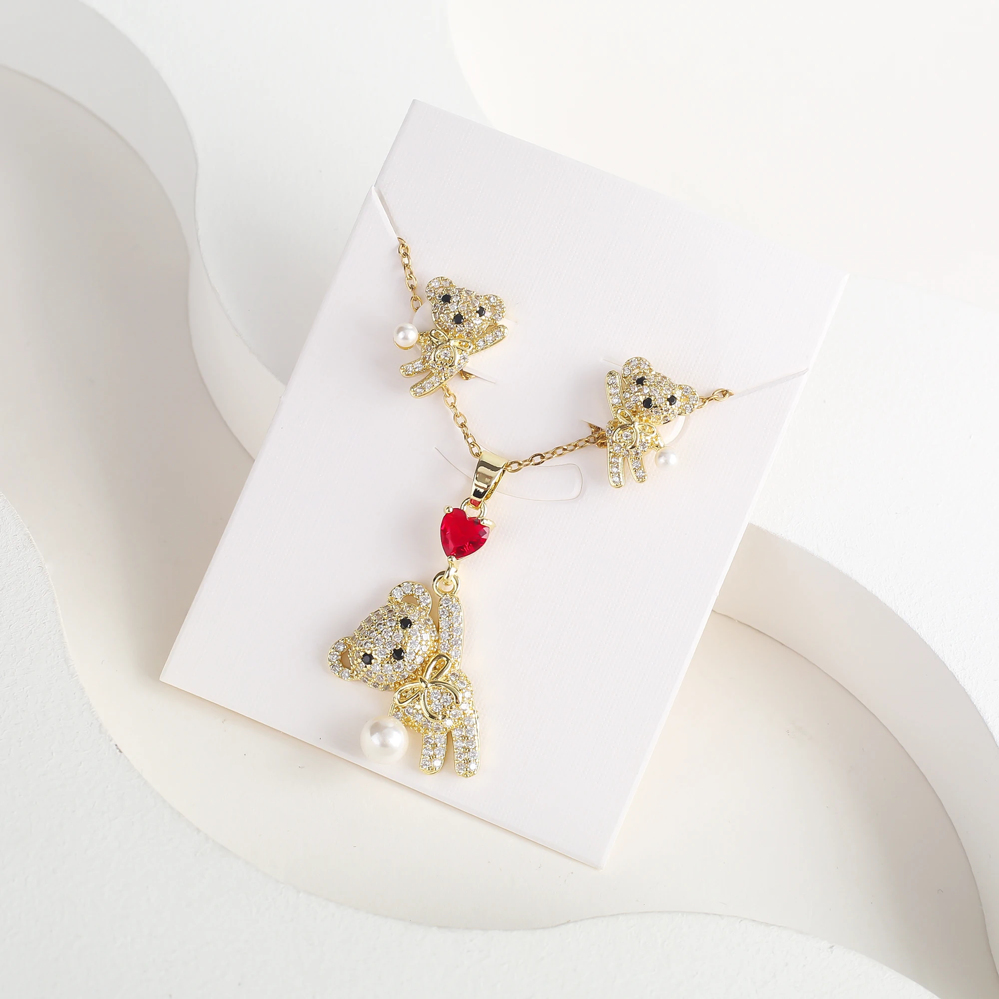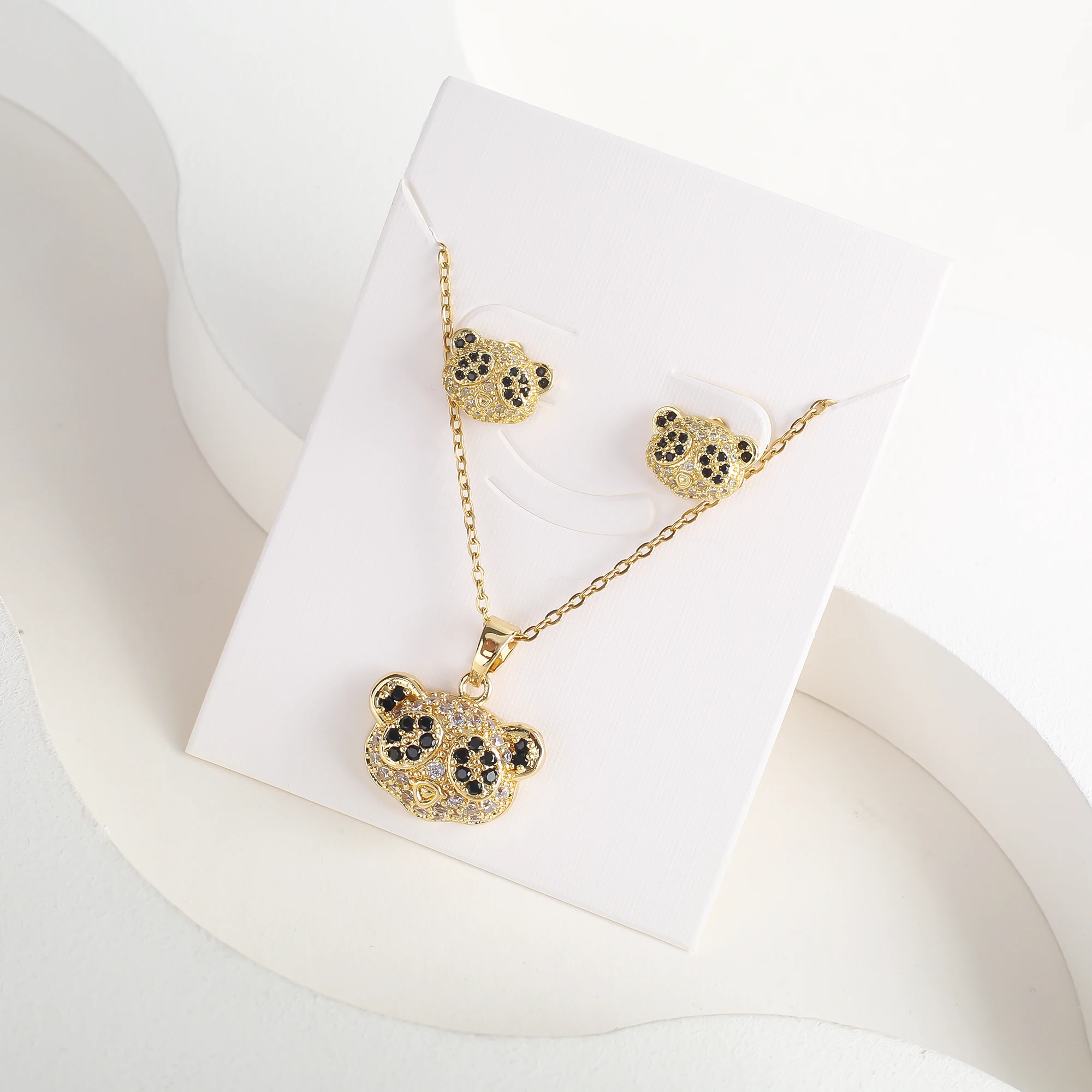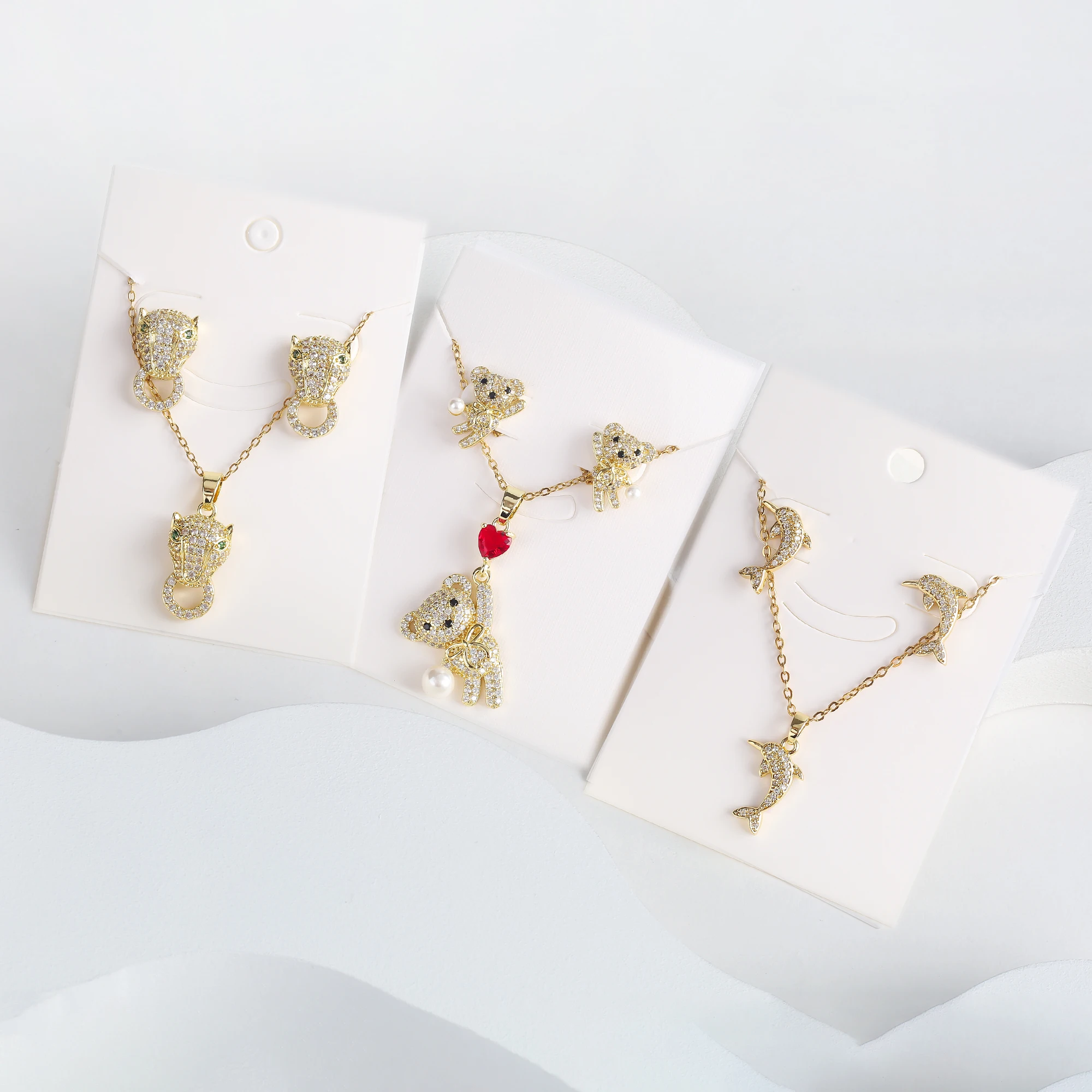 New Cute Zirconia Animal Bear Dolphin Leopard Dog Pendant Necklace Set Girls Anti-Allergy Earrings Holiday Party Gift Wholesale
