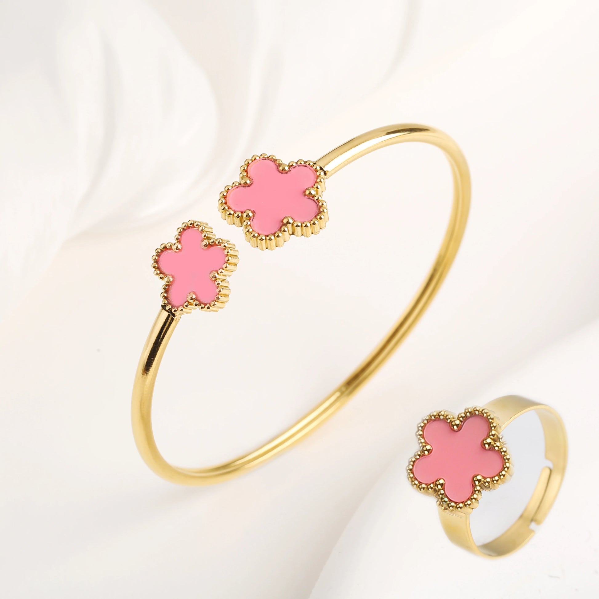 Name: New Design Lucky Stainless Steel FIve Leaf Flower Bangle Ring Jewelry Set for Women Waterproof Fashion Jewelry Party Gift Clover