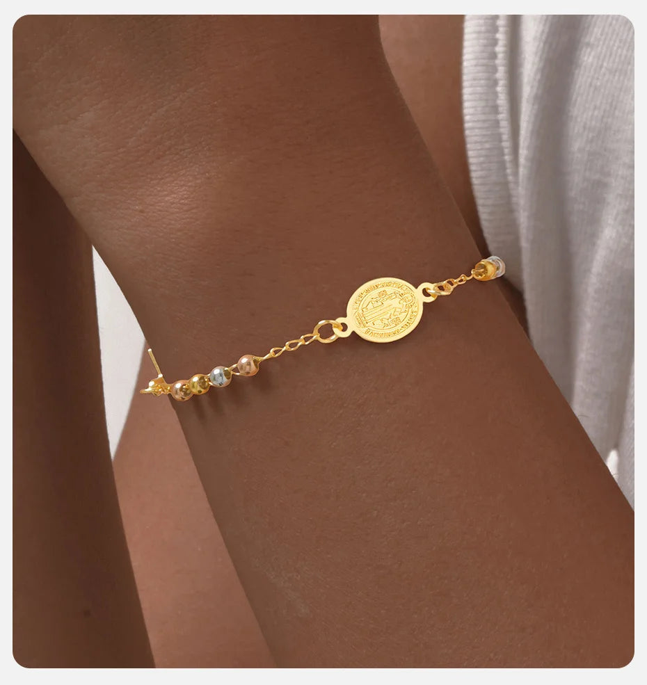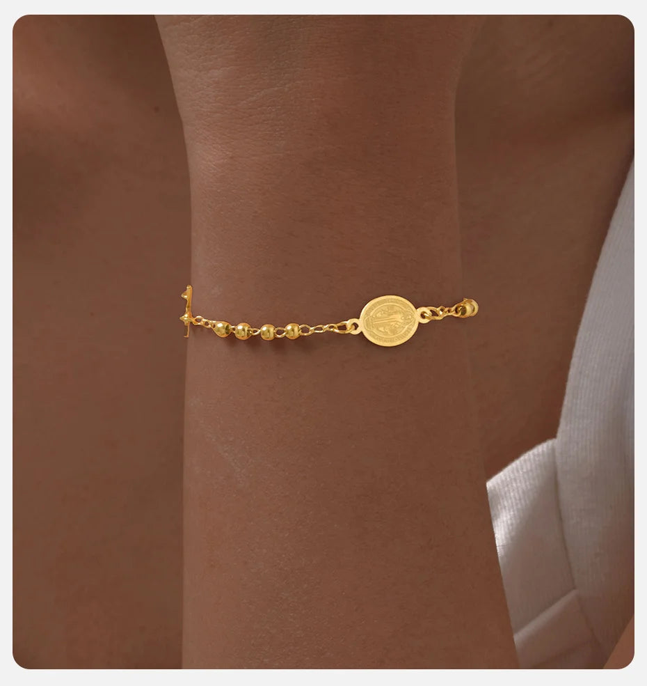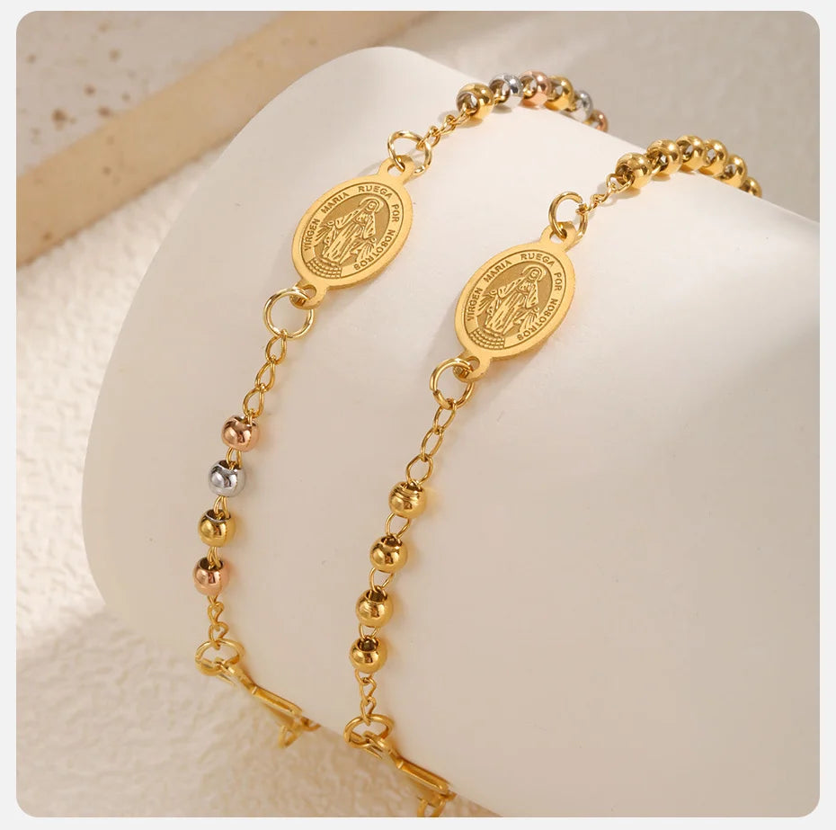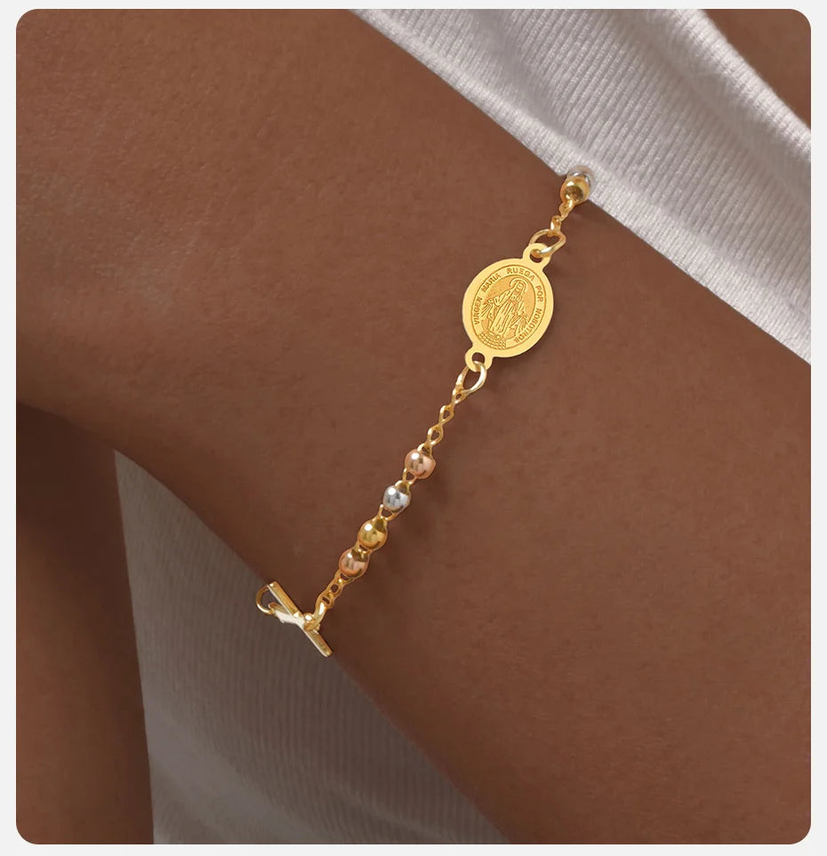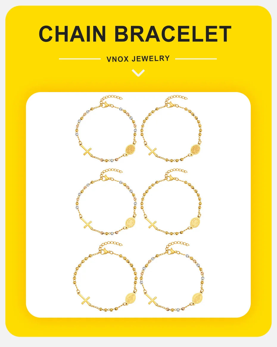Vnox Stainless Steel Beaded Virgin Mary Bracelet,Charm Rosary Cross Chain Bracelet For Women,Religion Christ Three Color Jewelry