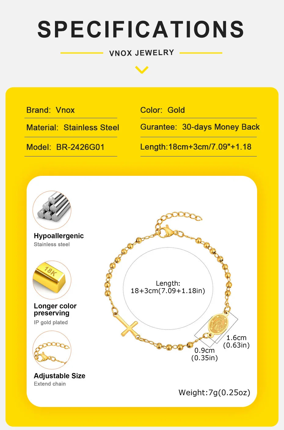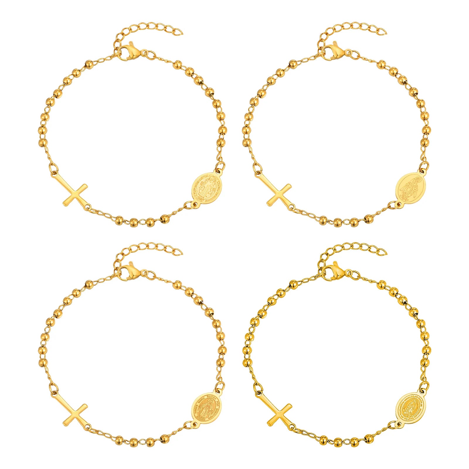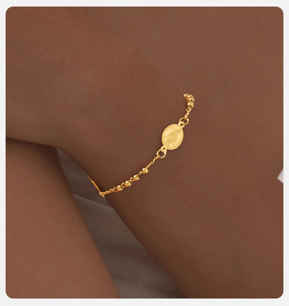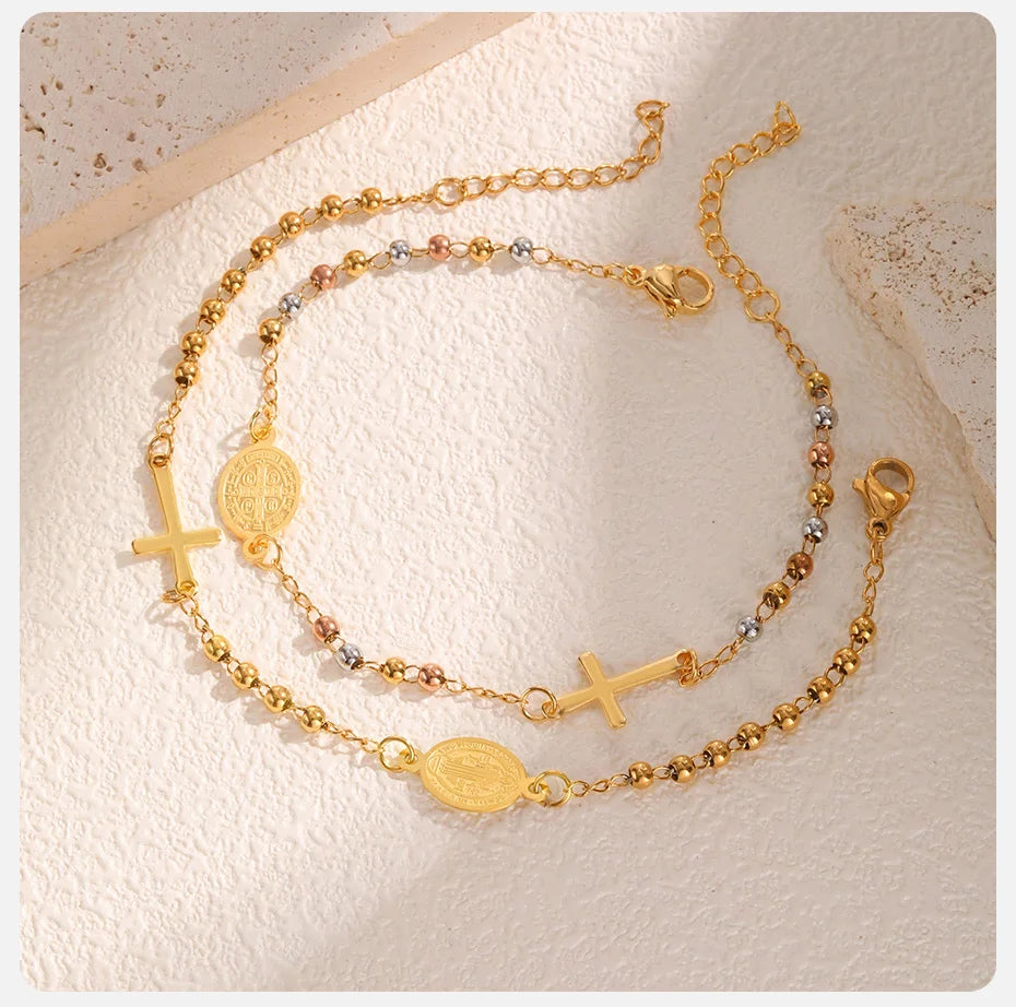 Vnox Stainless Steel Beaded Virgin Mary Bracelet,Charm Rosary Cross Chain Bracelet For Women,Religion Christ Three Color Jewelry